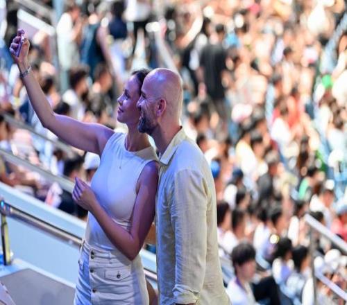 2025年10月7日,上海,久事体育场馆旗忠网球中心,白女士夫妇在训练场自拍。澎湃新闻记者 朱伟辉 图