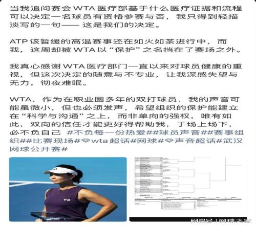 她表示,上海大师赛出现如此严重的球员状况,但球员仍然被强制出战比赛,很多球员如德约科维奇,甚至比赛中呕吐和严重身体不适,ATP该暂缓的高温赛事还在如火如荼进行中,而自己,这周却被WTA以“保护”之名挡在了赛场之外。