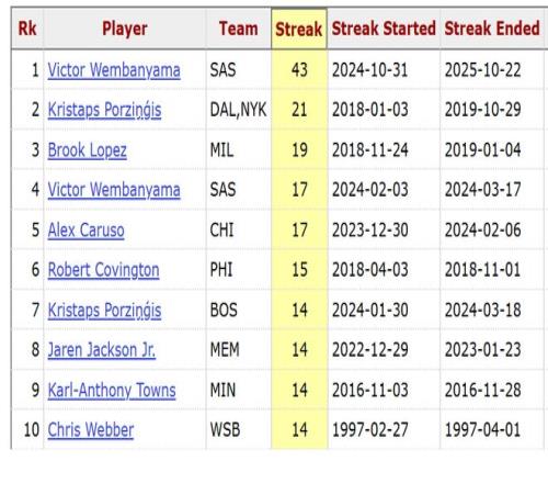 此战之前,文班亚马创造了连续43场比赛至少1三分+1盖帽的壮举,创造了独一档的NBA纪录,排名历史第二的是波津的连续21场。今日对阵鹈鹕,文班虽然有9个盖帽,但三分球3中0,他的这个NBA纪录就此中断,止步于连续43场。