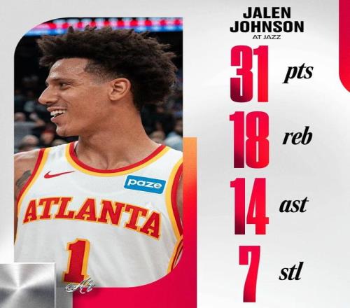 拿上一场对阵爵士的比赛来说,杰伦约翰逊打出了生涯最强的一场比赛:全场出战41分钟,投篮19中10,三分5中4,罚球11中7,拿下31分18篮板14助攻7抢断的准四双,正负值+16全队最高。