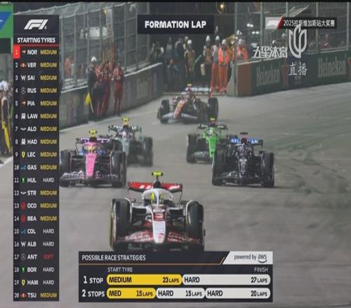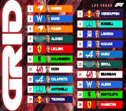 在昨天结束的排位赛中,诺里斯强势夺得杆位,维斯塔潘获得第二在头排发车。而塞恩斯发挥出色排在第三,和拉塞尔处在第二排发车,另一位麦克拉伦车手皮亚斯特里仅排在第五位。而因为受到天气影响,安东内利、汉密尔顿在Q1被淘汰,这显然给正赛带来了更多变数。
